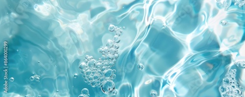 © Dalibor, Naklejka premium A body of water with many bubbles floating on the surface. The bubbles are scattered throughout the water, creating a sense of movement and energy. The blue color of the water
