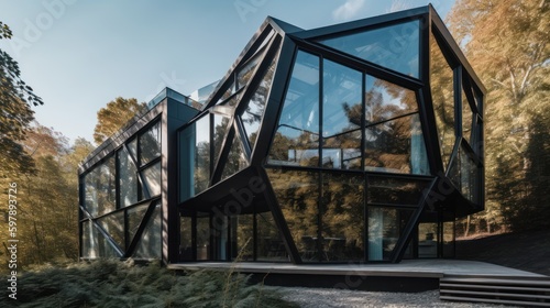 Obraz premium A bold angular structure with floor-to-ceiling windows. House exterior design. AI generated