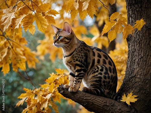 © Shoaib, Fototapeta premium A bold Bengal cat climbing a tree with golden autumn leaves
