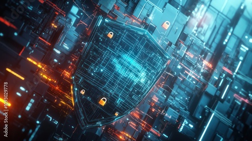 Fototapeta premium A bold 3D illustration of a shield integrated into a digital interface. The shield displays a holographic grid pattern, surrounded by floating padlocks and data packets.