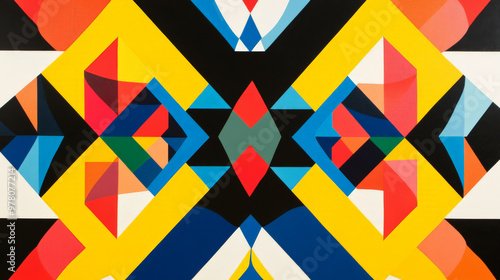 © AI_images_for_people, Obraz premium A bold geometric pattern with overlapping shapes in bright primary colors, arranged symmetrically to form a striking, playful design with sharp lines and angles.