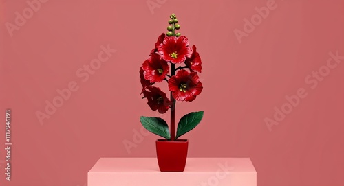 Fototapeta premium A bold hollyhock flower figurine with vibrant blooms on a plain scarlet red...