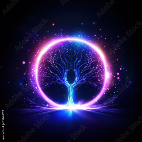 Fototapeta premium A bold neon tree with glowing branches and leaves in dynamic gradients of teal and magenta, surrounded by swirling light patterns and faint sparkles, symbolizing growth and modernity.