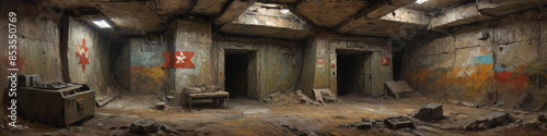 Obraz premium A bold oil painting with dense, layered paint depicting a Soviet-era underground bunker complex, highlighting its monumental scale and military functionality, Generative AI