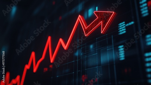 Naklejka premium A bold red arrow pointing upward on a dark background, symbolizing economic...