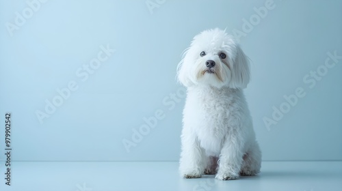 Obraz premium A Bolognese dog sitting gracefully on a light solid color background,...