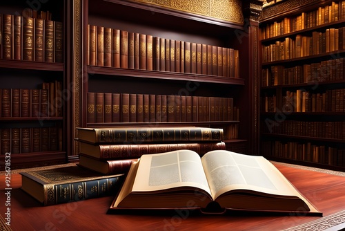 © Sutarto Stock, Fototapeta premium A bookcase full of books with a book open on a table