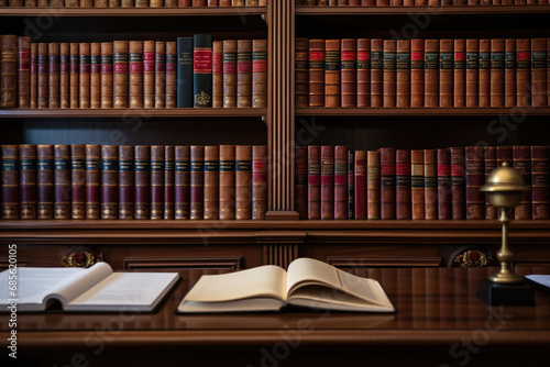 © Planetz, Fototapeta premium a bookshelf containing volumes of books about Law in Library. Rows of Books and Legal References in a Law Firm