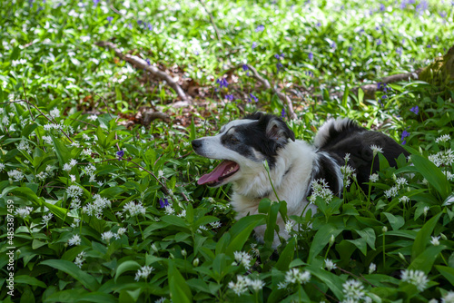 Fototapeta premium A Border Collie dog resting in the shade on a carpet of wild garlic (Allium...