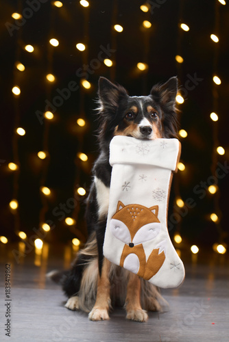 © Anna Averianova, Obraz premium A Border Collie holds a white Christmas stocking decorated with a fox. Warm bokeh lights hang in the background of a cozy studio scene.