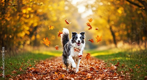 © khuram, Fototapeta premium A Border Collie Running Through a Clearing in an Autumn Forest, Kicking up Fallen Leaves_