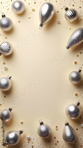 Fototapeta premium A border of silver and gold Christmas ornaments on a beige background.