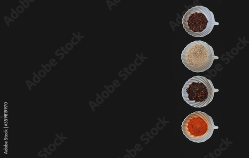 © Айман Дайрабаева, Fototapeta premium A border of spices and grains in white cups on a black isolated background. Top view