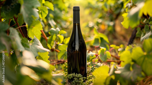 © KEA, Fototapeta premium a bottle of French or Italian red wine stands in the vineyard between the vines.
