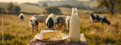 Fototapeta premium A bottle of milk on the table, next to a plate with a slice of cheese