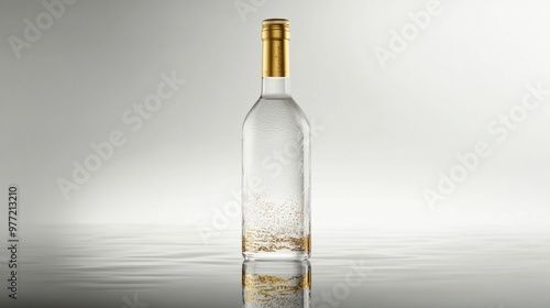 Fototapeta premium A bottle of premium vodka with gold accents, standing upright on a reflective...