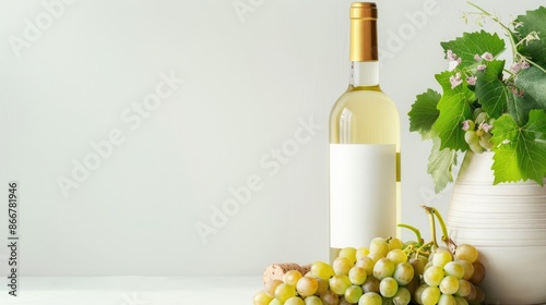 © Phakawan, Fototapeta premium A bottle of white wine stands elegantly among clusters of green grapes and lush vine leaves, presenting a fresh and inviting scene perfect for celebrating.