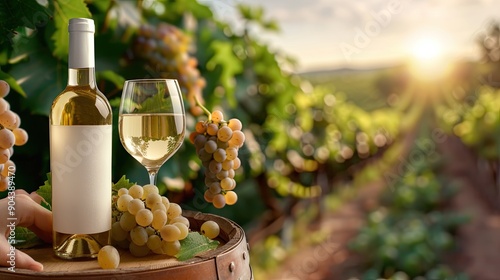 © lililia, Fototapeta premium A bottle of wine and a glass rest atop a wooden barrel, with fresh grapes nearby and a beautiful vineyard landscape in the background during sunset