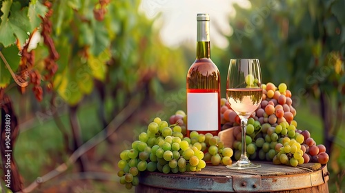 Fototapeta premium A bottle of wine and a glass rest atop a wooden barrel, with fresh grapes...