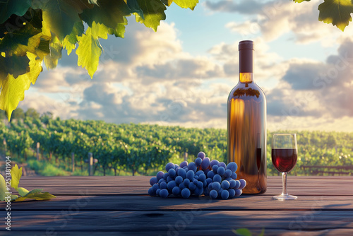 © Daria Sauer, Fototapeta premium A bottle of wine stands with glass wine on a wooden table, next to it lie bunches of blue grapes, in the background is a vineyard field