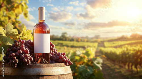 © Ruslan, Fototapeta premium A bottle of wine with a white label mockup stands on a wooden barrel next to a grape branch on a blurred background of vineyards and a pleasant warm sunlight