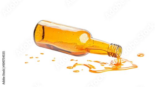 © Oatkhaphon, Fototapeta premium A bottle spills golden liquid on a black surface, creating a striking visual contrast and evoking a sense of richness and abundance.