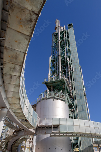 © Vinicius, Obraz premium A bottom-up wide-angle view of an abandoned old refinery tower made of steel with its round ramp framing the image in a sunny day with a blue sky in Lisbon, Portugal.