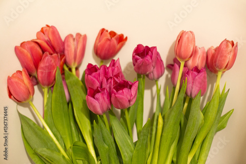 © Tsyb Oleh, Fototapeta premium a bouquet of beautiful colored tulip flowers on a white background