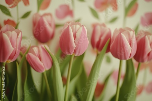 © Alena, Fototapeta premium A bouquet of fresh pink tulips arranged in a decorative vase