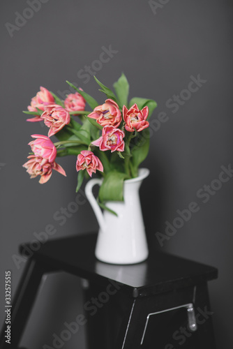 Fototapeta premium A bouquet of pink peony tulips in a white jug.