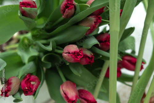 Fototapeta premium A bouquet of red tulips is in a tray in the greenhouse.Small business.Spring concept,gardening.Women's and Mother's Day.Selective focus.