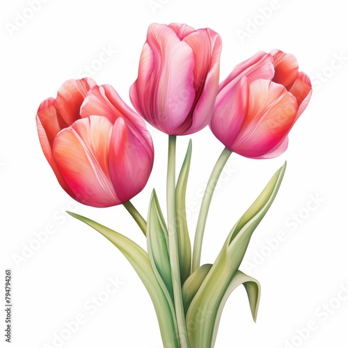 © NEW, Fototapeta premium A bouquet of three pink tulips with green leaves on a white background.