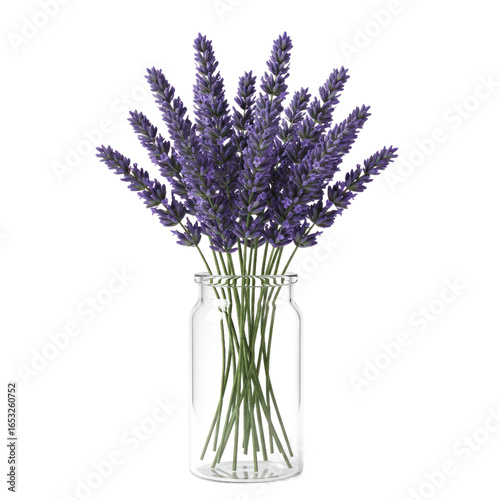 © pupus, Naklejka premium A bouquet of vibrant purple lavender blossoms in a clear glass vase.