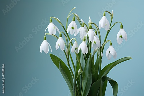 Fototapeta premium A bouquet of white snowdrops on a light blue background