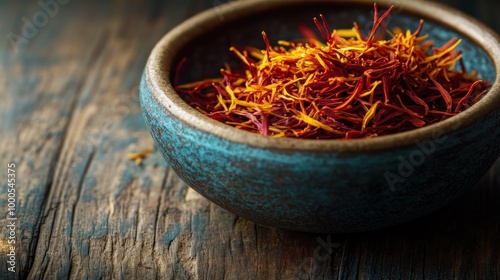 © BerkahStock, Fototapeta premium A bowl filled with vibrant saffron threads on a rustic wooden surface.
