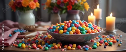 © methinee, Fototapeta premium A bowl of colorful candy and sweets on a decorated table with candles and flowers, festive desserts, flowers, sweet treats
