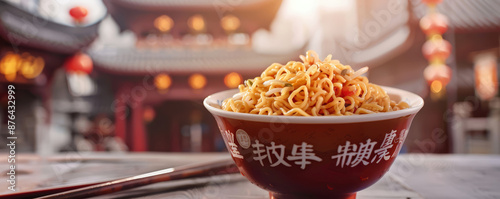 Fototapeta premium A bowl of instant noodles followed by Chinese architecture background