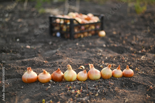 © Olena Vasylieva, Obraz premium A box of onions is on the ground. harvest