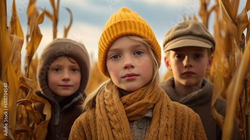 © ProPhotos, Obraz premium A boy and two girls, members of a family, share a moment of joy against a backdrop of golden corn, celebrating their bond during the fall season.