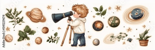 Naklejka premium A boy is looking through a telescope. There are many planets and stars in the background. A potted plant is in the foreground