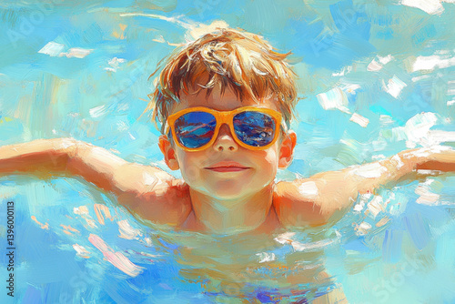 © Nail, Naklejka premium A boy joyfully splashing in a shimmering lake, surrounded by lush green trees under a clear blue sky.