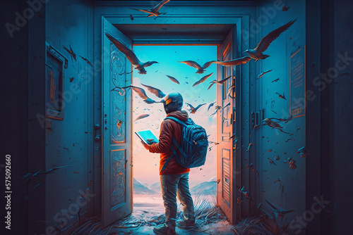 Obraz premium A boy man with a virtual reality glasses looking at a book, made with...