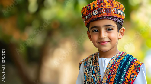© Sarvana, Fototapeta premium A boy wearing traditional Moroccan attire playing outdoors