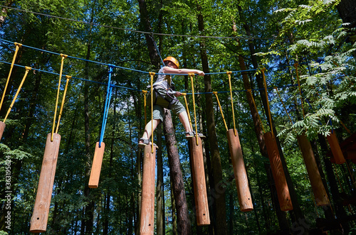 Fototapeta premium A boy with a helmet and insurance passes a high-altitude obstacle course.