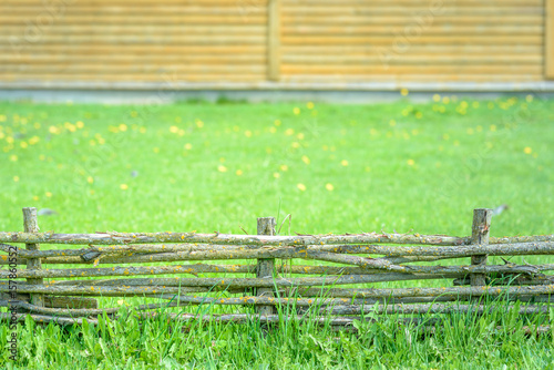 Fototapeta premium A braided wooden fence made of thin branches in the countryside against green lawn at the neat farm