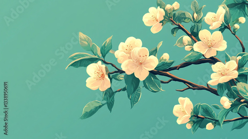 Fototapeta premium a branch of a blooming tree with green leaves and flowers, beautiful background
