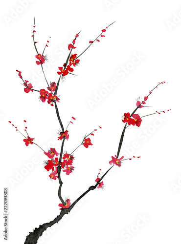 © marinakutukova, Fototapeta premium A branch of a blossoming tree. Pink and red stylized flowers of plum mei, wild apricots and sakura . Watercolor and ink illustration in style sumi-e, u-sin. Oriental traditional painting.
