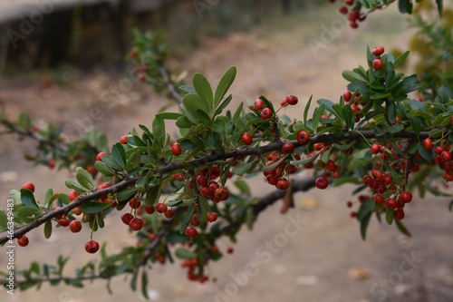 Obraz premium A branch of a bush with berries called Pyrancantha coccinea