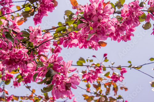 Fototapeta premium A branch of a pink blooming Apple tree branch in spring on a clear day, flower background