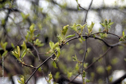 Obraz premium a branch of a shrub with young green leaves